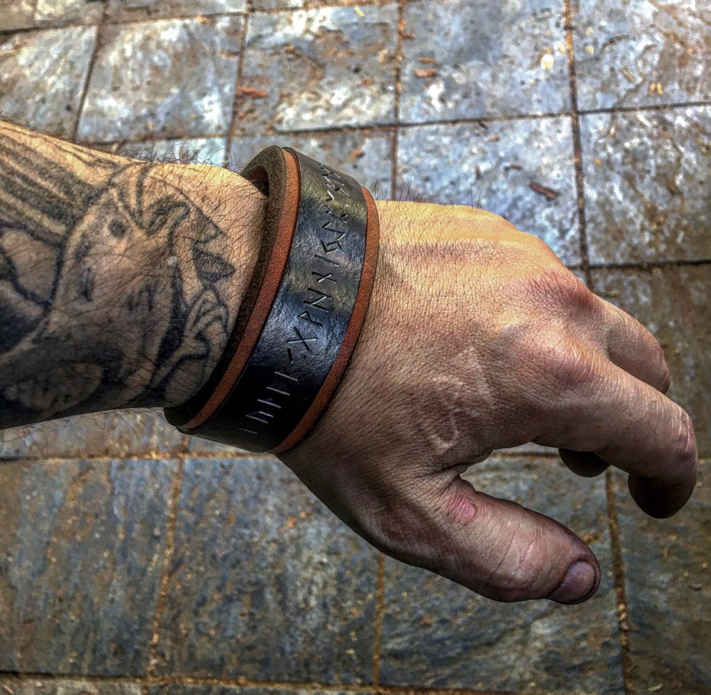 Genuinely hand crafted Torc style bracelets. Immensely thick, rustic leather clasped with a slightly bendable iron armor shank. Iron shank is inscribed with the 24-rune symbols of the ELDER FUTHARK rune row — which is one of the most commonly depicted orders or sequences found upon relics. Ultimately, this magical sequence of runes forms a path to the most powerful incarnation and Saga. Each is individually crafted and ever so slightly unique.